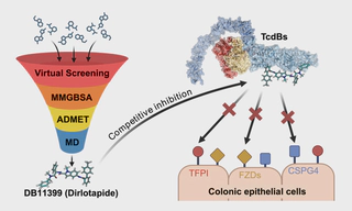 Clostridioides difficile infection (CDI), a leading cause of antibiotic-associated diarrhea, is driven by the virulence factor toxin B (TcdB), whose receptor-binding interfaces (RBIs) exhibit evolutionary divergence into α and β subtypes with distinct host–receptor specificities. Leveraging this insight, we developed a multistage computational pipeline to repurpose FDA-approved drugs as pan-RBI, pan-subtype TcdB inhibitors. Virtual screening of 10,027 compounds against AlphaFold3-predicted TcdB1–8 structures, integrated with molecular docking (AutoDock Vina/LeDock), MM/GBSA binding free energy calculations, and molecular dynamics simulations, prioritized three candidates. Dirlotapide (DB11399) emerged as the lead compound, demonstrating high-affinity binding to TcdB2 via surface plasmon resonance (SPR) and triggering partial unfolding of its α-helical structure as measured by circular dichroism (CD). In vitro, Dirlotapide rescued Caco-2 cells from cytotoxicity induced by all four major TcdB subtypes. Following rectal administration in mice, it protected against TcdB2-induced colonic damage, restored epithelial integrity, and significantly reduced proinflammatory cytokines (IL-6, TNF-α). Validation of gut-restricted pharmacokinetics, intestinal permeability, CYP450 interactions, and low nephrotoxicity supports its translational potential. Dirlotapide represents a rapidly repositionable anti-TcdB agent that neutralizes clinically relevant subtypes through dual RBI blockade.